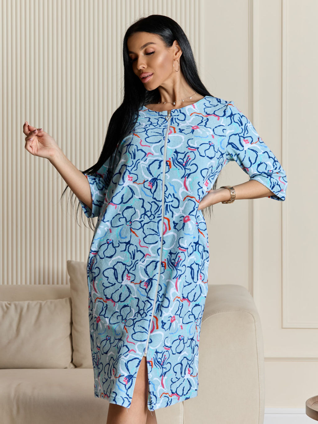 Домашний халат на молнии из турецкой махры, длиной до колена, с карманами в боковых швах, рукавом 3/4 и О-образной горловиной. Наш великолепный халат станет отличным подарком маме, бабушке, сестре. Приятная расцветка будет радовать глаз, а мягкая махра тело.­