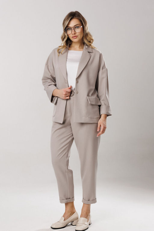 Состав: Вискоза-32%; ПЭ-65%; Спандекс-3%; Элегантный комплек-двойка, состоящий из свободного блузона без подкладки, со спущенной линией плеча и современными брюками, зауженными к низу. Блузон, прямого свободного силуэта, со спущенной линией плеча, рукавом 7/8 с отворотом. Спинка состоит из горизонтальной кокетки, среднего шва, в котором расположена открытая шлица. На полочке блузона, на уровне ниже талии, расположены накладные карманы с отворотом-клапаном. Застежка фронтальная, петли/пуговицы. Горловина оформлена воротником с отложным воротником с лацканом. Длина изделия по спинке 65-66 см, длина рукава вместе со спущенной линией плеча 65 см. Брюки современного силуэта, в стиле бананы. Карманы-хулиганы расположены в боковых швах. На задней части брюк расположен ложный карман-листочка. Фронтальная застежка на клапан-молнию (гульфик) и пуговицу. Для дополнительной фиксации объема талии спереди расположены полупояса с пряжкой из полуколец. На линии талии переда, также расположены складки-защипы для свободы входа в карман. Оканчиваются брюки деликатным отворотом, шириной 2,5 см. Длина брюк по боковому шву с отворотом 99 см. Представленная фурнитура может отличаться от представленной на фото/видео материале. Особые рекомендации: рекомендуется холодная деликатная ручная стирка, без использования отбеливающих СМС, без интенсивного трения. Сушка в вертикальном положении. ВТО с минимальным паром. -- Характеристики -- Состав: Вискоза-32%; ПЭ-65%; Спандекс-3%; Сезон: Весна Рост: 164 Страна бренда: Беларусь