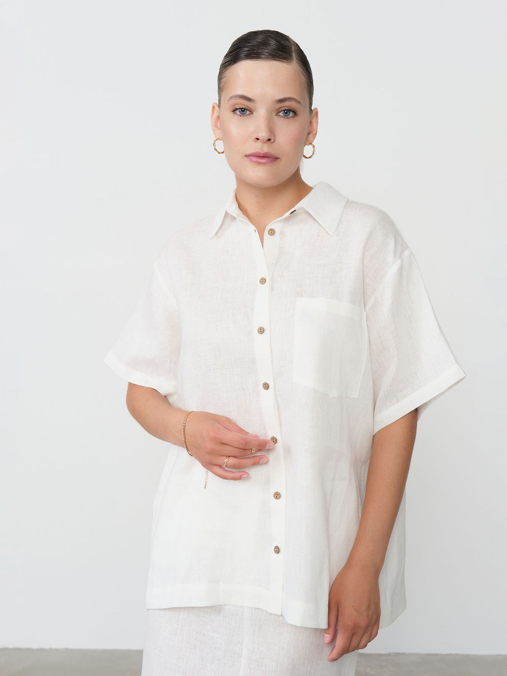 Классический свободный крой с отложным воротником и удлиненным силуэтом создает универсальный фасон, который подчеркивает женственность, сохраняя полную свободу движений. Эта рубашка одинаково хорошо сочетается с бежевыми льняными брюками для гармоничного ансамбля, с джинсами для городского стиля или с шортами для пляжного образа. Аккуратные детали в виде пуговиц из натуральных материалов и продуманный крой подчеркивают качество исполнения.