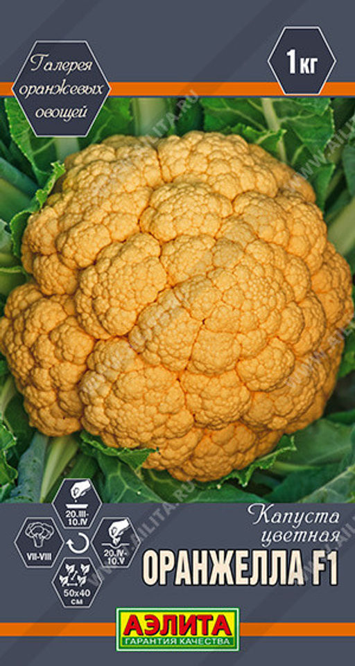 Овощи самых разных окрасок украшают любое застолье. Оранжевые это настоящая бомба из витамина С и каротина, который в организме превращается в провитамин А. Добавляйте их в рацион питания и они укрепят ваш иммунитет. Оранжевый цвет радости, оптимизма и здоровья! Цветная капуста с таким цветом головок большая редкость! Гибрид раннеспелый, готов к уборке уже через месяц после высадки рассады. За сезон можно получить 2 урожая. Головки плотные, ровные, массой до 1 кг. Соцветия нежные и хрустящие, приятного вкуса. Они отлично подходят для салатов, консервирования и замораживания. Гибрид неприхотливый, холодостойкий, растет и развивается быстро. Урожайность 4-6 кг/м2.