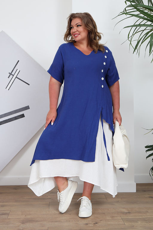 Стильное платье из мягкого струящегося материала. Модель имеет V-образный  вырез и короткие рукава. Формирующий шов сбоку декорирован оригинальными пуговками. Контрастный подол освежает образ и добавляет нарядности. Асимметричный низ зрительно вытягивает силуэт и визуально стройнит. Свободный силуэт и мягкий материал искусно обыгрывают фигуру и дарят комфорт в течение всего дня. Платье создано для того, чтобы подчеркивать достоинства и скрывать недостатки. Стильный клатч и туфли на каблуках станут идеальным дополнением к нарядному образу.