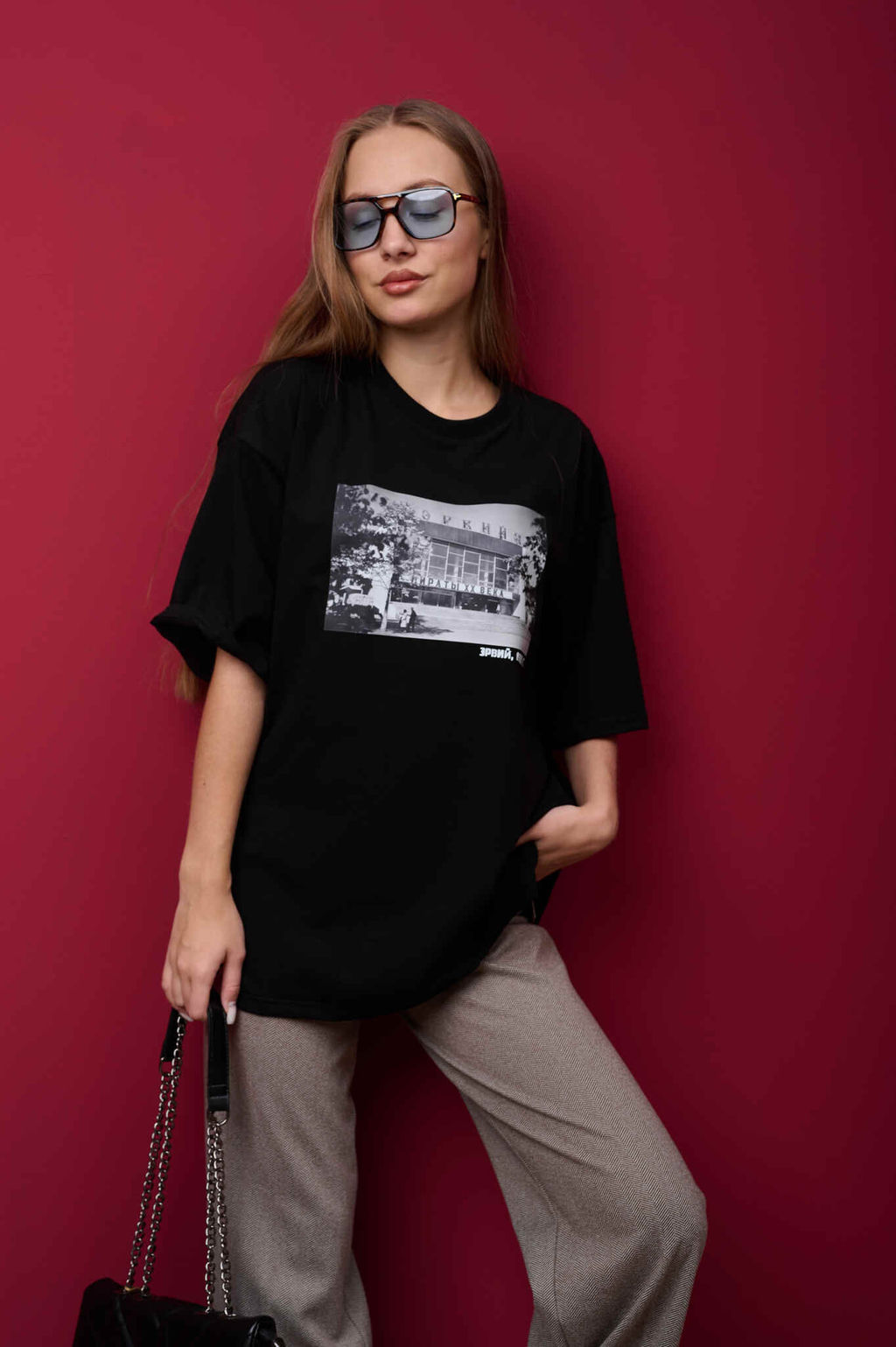 Футболка унисекс в стиле оверсайз из серии "Архитектура", на груди изображен кинотеатр "Эрвий.