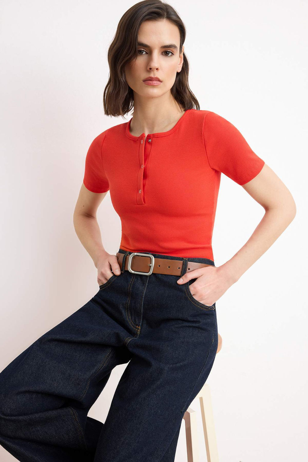 K?rm?z? Fitted/Vucuda Oturan C?tc?tl? K?sa Kollu Fitilli Esnek Orme Bluz TWOSS26BZ00334