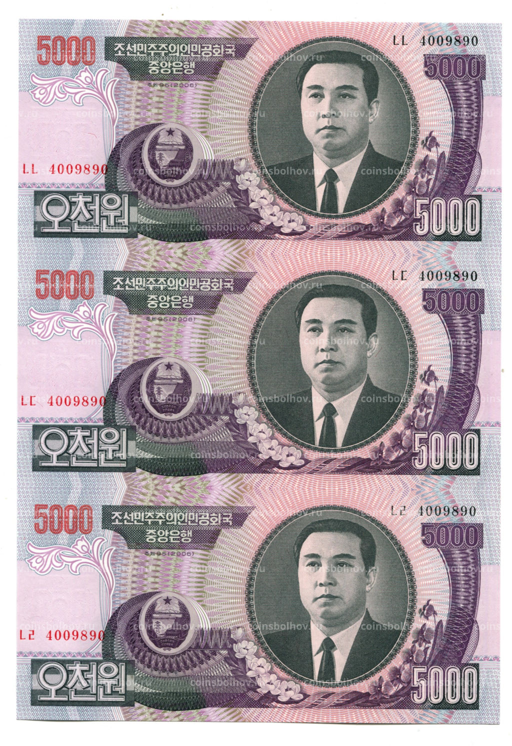 • Банкнота 5000 вон 2006 года Северная Корея  Лист из трех банкнот