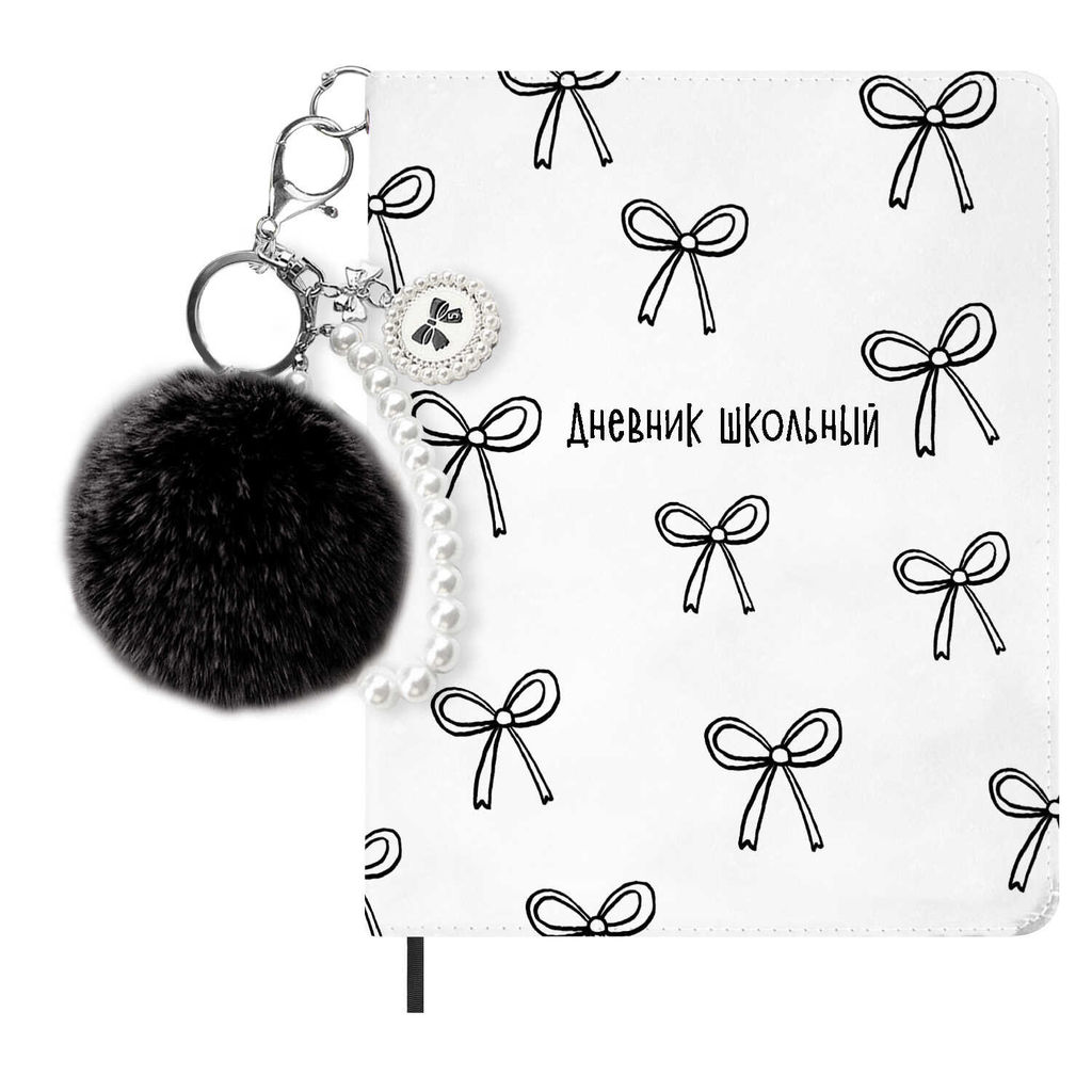 Дневник школьный в комплекте с брелоком, формат А5+, 48 листов арт. 72425 / 15 БАНТИКИ НА БЕЛОМ (кожзам: А5+; твёрдый переплёт с поролоном, материал обложки: искусственная кожа "Наппа"; декор: печать полноцветная; способ крепления блока: ниткошвейный; вн. блок: 48 л., белый офсет 80 г/м?, печать в одну краску, справочный материал: универсальная шпаргалка; закладка: одно ляссе; форзац: печать в одну краску; особенности: брелок из искусственного меха в комплекте; индивидуальная упаковка: ПЭТ-пакет)