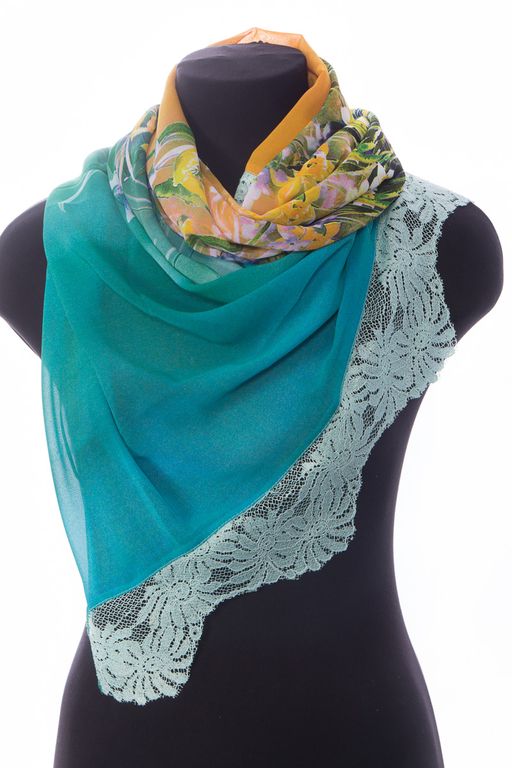 Изысканный палантин выполнен из легкого, но плотного шифона - браш. Сложный принт и цвет переходит от бирюзового через желто - зеленый в горчичный. Универсальная расветка подойдет ко многим Вашим образам. Нежная эластичная ткань великолепно струится и чудесно ложится складками. Отдела - великолепное кружево.
