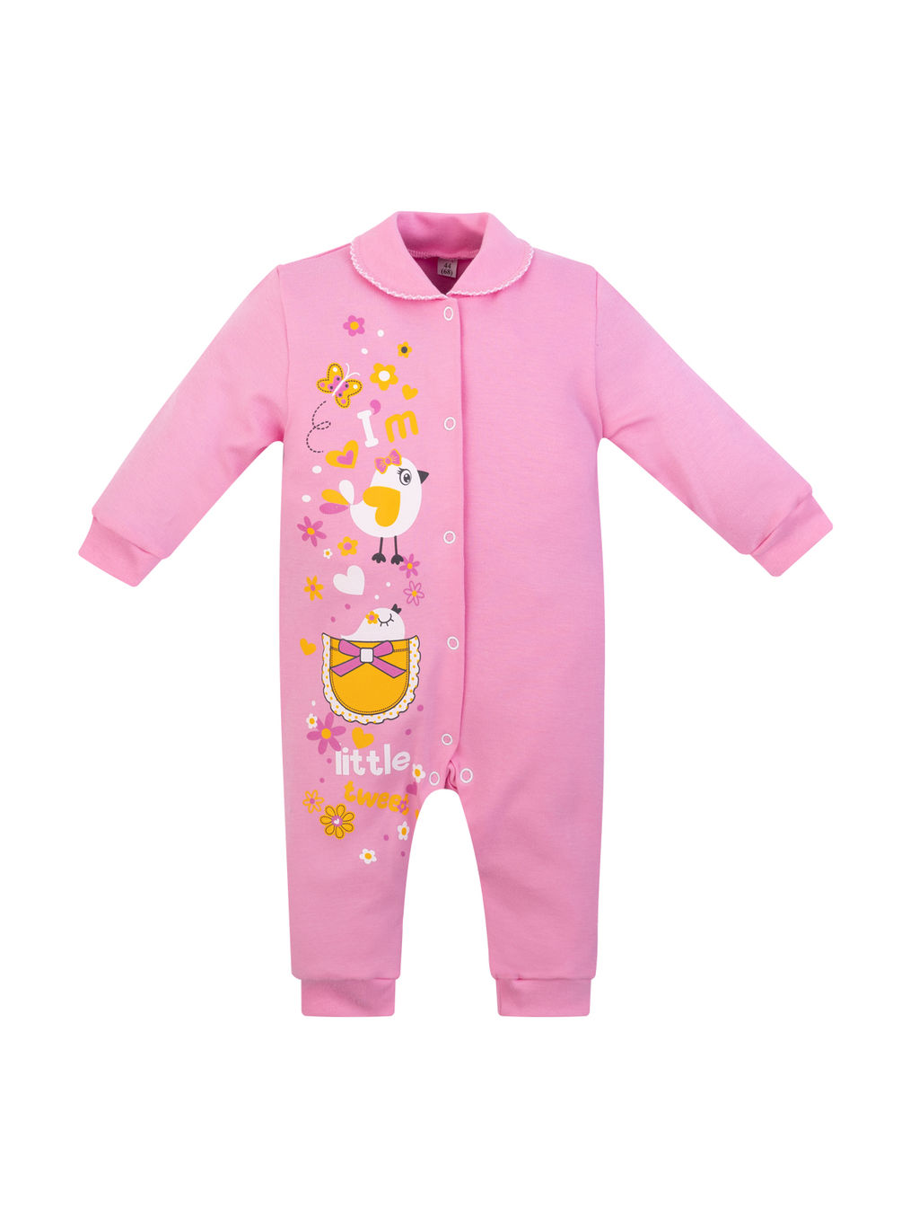 Трикотажный ясельный комбинезон пригодится малышам для носки в прохладные дни. Модель выпускается из гладкого и мягкого на ощупь интерлока розового цвета. Изделие имеет отложной округлый воротничок, открытые ножки, на штанинах и на рукавах манжеты. Прочные кнопки-застёжки проходят по передней стороне комбинезона. На одной половинке спереди принт поющие птички.