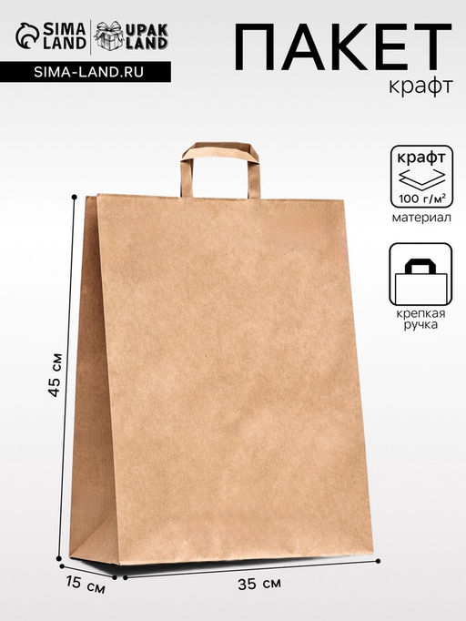 Надежная упаковка для важных вещей! Крафт-пакет с плоской ручкой 35×15×45 см — это прочная и экологичная упаковка из плотной крафт-бумаги. Подходит для хранения, переноски и презентации подарков. Лаконичный дизайн делает пакет универсальным решением для дома и бизнеса.Вместительный размер: Габариты 35×15×45 см позволяют упаковать крупные предметы — от одежды до книг и подарков. Боковая складка добавляет объема, а плоская бумажная ручка не врезается в пальцы при переноске.Плотность 100 г/м²: Бумага выдерживает нагрузку до 5 кг, не рвется при контакте с острыми углами. Подходит для многократного использования — пакет сохраняет форму даже после наполнения.Универсальный дизайн: Классические бежевый и коричневый цвета сочетаются с любым стилем. Без принтов и надписей — пакет легко дополнить декором или фирменной символикой.Экологичность: Крафт-бумага разлагается без вреда для природы. Не содержит пластиковых элементов — безопасен для продуктов и хрупких вещей.Где использовать: Упаковка подходит для магазинов, мастерских и повседневных нужд. Вмещает одежду, продукты, инструменты или подарки на день рождения. Плоская ручка удобна для переноски, а прочный шов исключает разрывы. Выбирайте натуральную упаковку — практичную и стильную! Для кого: Унисекс. Плотность, г/м²: 100. Длина, см: 35. Ширина, см: 15. Высота, см: 45. Рекомендуемая нагрузка, кг: 5. Тематика: Однотонная. Вид упаковки: Крафтовая упаковка. Рисунок: Нет. Символ года: Нет. Тематика праздника: Универсальная тематика. Тематика праздника: День рождения. Отделка пакета: Декор. Отделка пакета: Крафт. Расширение: Боковая складка. Вид ручки: Бумажная. Назначение: Для хранения. Назначение: Универсальные. Форма пакета: Вертикальный. Особенности: Креативный. Вид: Крафт. Дизайн: Однотонный. Бесплатная доставка: Да. Примечание: Размер товара может отличаться от заявленного на ± 3 см..