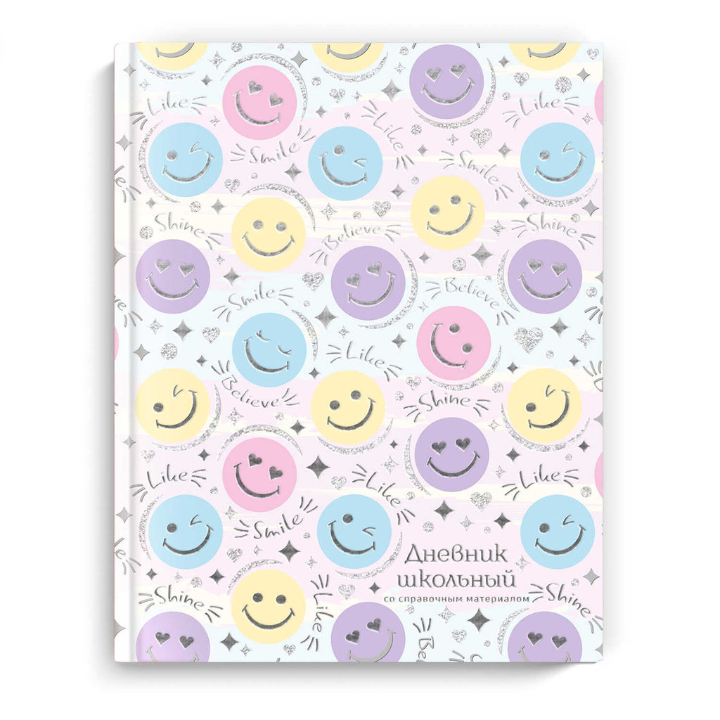 Дневник школьный арт. 66659 СМАЙЛ / твёрдый переплёт 7БЦ, А5+, 48 л., выборочный перламутровый лак, тиснение фольгой, матовая ламинация, печать в одну краску, универсальная шпаргалка/