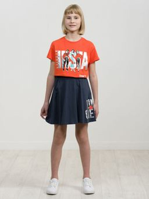 Комплект для девочек футболка и юбка. Футболка оверсайз силуэта. Принт фэшн стилизация графика шрифты серебряным металликом. Перевод. Инста сторис. Надпись белым Не знаю, все равно. Юбка полусолнце с принтом из серебряного металлика. Перевод. Забавный.
