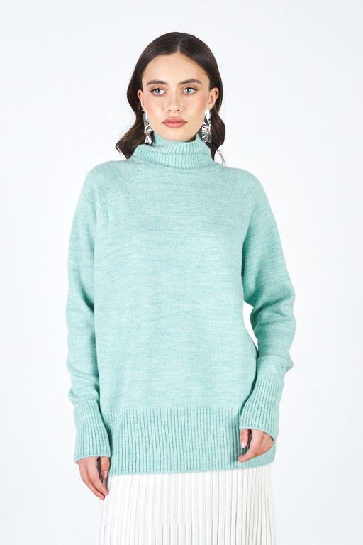 Джемпер свободного силуэта. Длинный рукав-реглан. Низ изделия и низ рукава оформлены резинкой, воротник-стойка. Изделие выполнено из мягкой меланжевой пряжи.