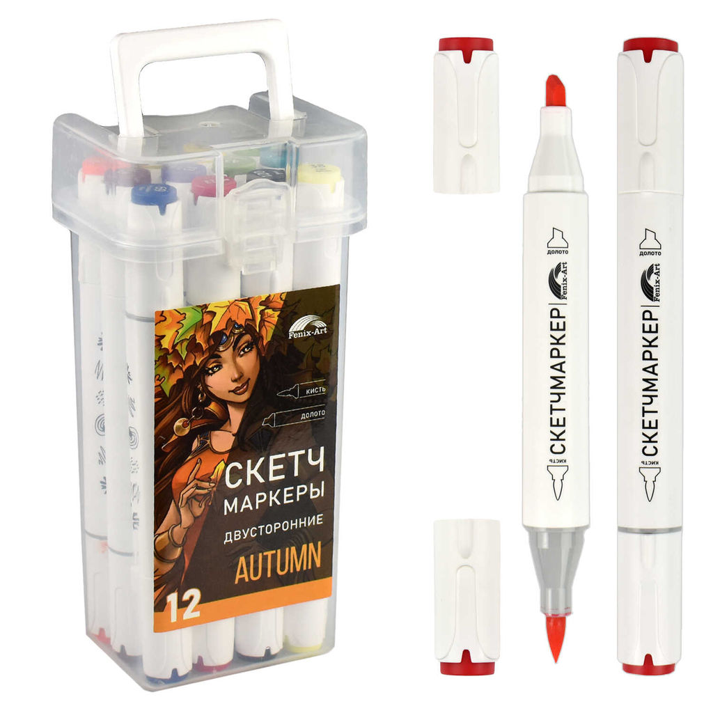 Набор скетчмаркеров двусторонних арт. 65501 / 2 ОСЕНЬ (12 цв., размер бокса: 8х16,5х6,4 см, цвет корпуса: белый, материал: полипропилен, полиэстер "Фетр", нейлон, состав чернил: на спиртовой основе, толщина наконечников: "долото" - 6,2 мм, "кисть" - 1-6 мм, раскладка для выкраски цветов в комплекте, пластиковый бокс с полноцветным стикером + картонная коробка).