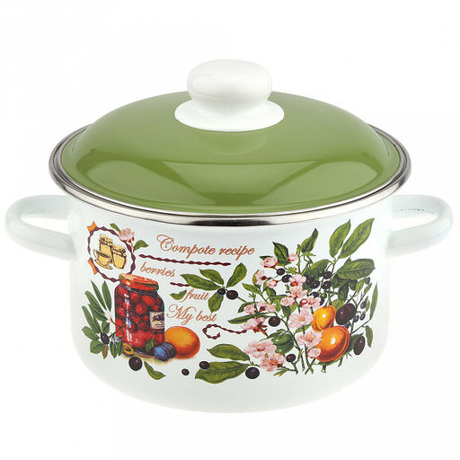 • "Вкусный компот" Кастрюля эмалированная 3л, д20см, h12,5см, цилиндрическая форма, металлическая крышка, белый (Россия)