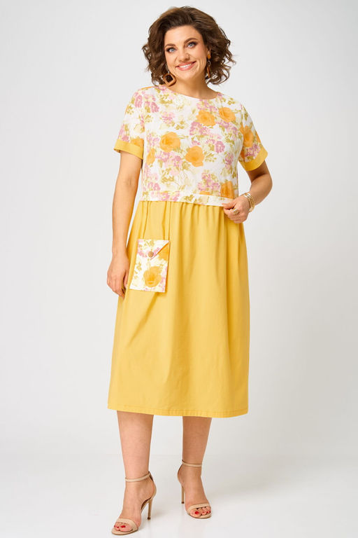 Платье свободного кроя. Вырез округлой формы. Верх платья с завышенной талией: по переду нагрудные вытачки, по спинке центральный шов с застежкой на молнию. Низ платья свободная летящая юбка со сборкой из-под верхней части платья и декоративное украшение в виде сумочки. В боковых швах юбки функциональные карманы. Рукав втачной короткий, понизу притачная манжета.