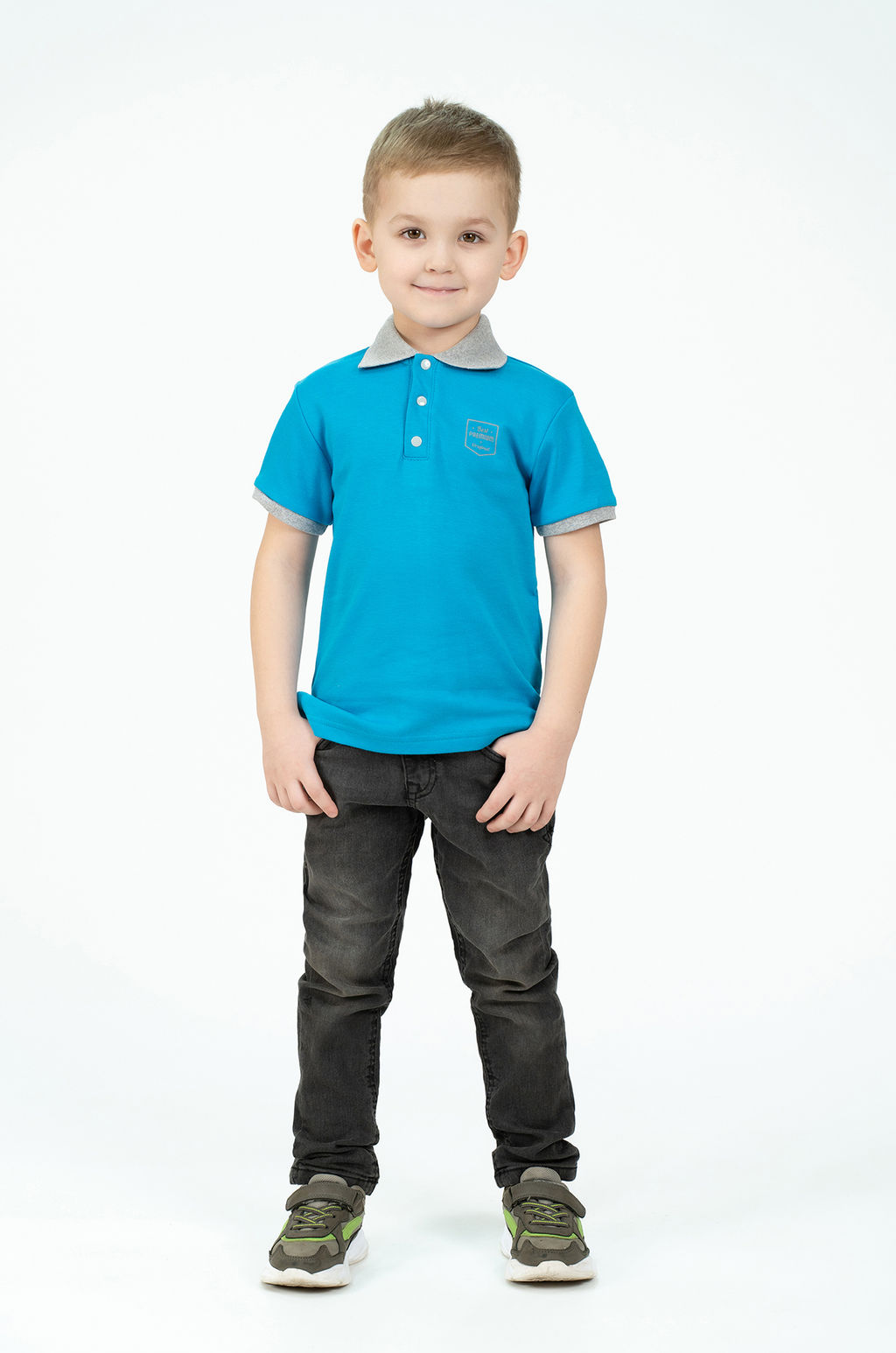 Дома или в детском саду мальчику будет удобно в трикотажном джемпере с короткими рукавами. Модель выполнена в стиле “поло”: горловина декорирована отложным воротником, под котором расположены кнопки-застёжки. Футболка-поло сшита из лёгкого, прочного и нежного на ощупь интерлока пенье. Край рукавов обработан трикотажной окантовкой. Выпускается модель в ярком бирюзовом цвете. Воротник и низ рукавов выполнены в сером цвете, сочетающимся с небольшим принтом на груди.