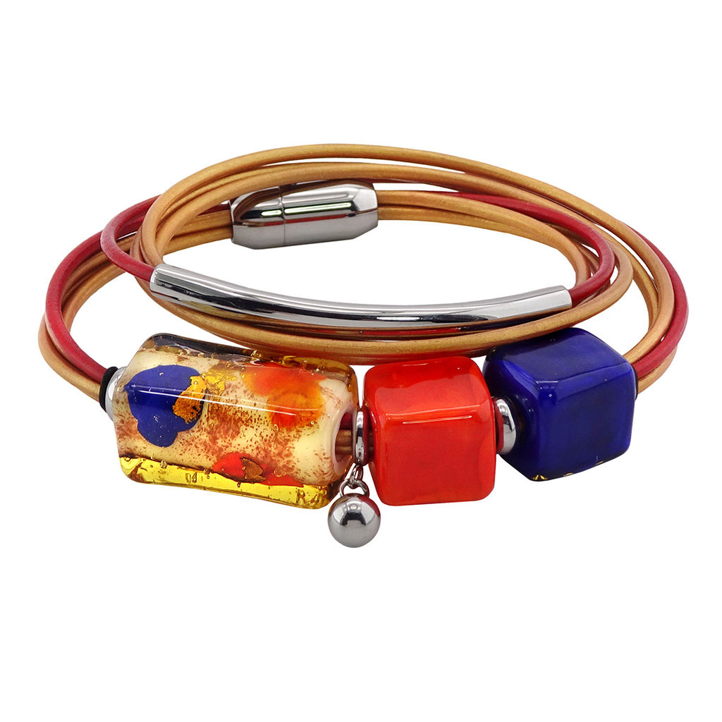 Браслет изготовлен из муранского стекла, натуральной кожи и гипоаллергенной ювелирной стали, что очень важно для людей с чувствительной кожей. Металл не темнеет и не подвергается воздействиям окружающей среды, надолго обеспечивая красивый внешний вид изделия. Крепкий магнитный замок с двойной защитой надежно фиксируется на запястье. Ширина браслета - 1 см. Размер регалиса - 2,4*1,4,   стеклянных кубов - 1,2 см. Вес -31 гр.