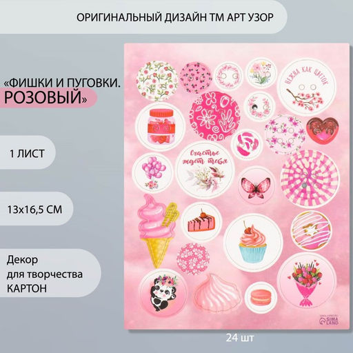 • Цена за 5 шт. Декор для творчества картон «Фишки и пуговки. Розовый», 24 шт., 13×16.5 см