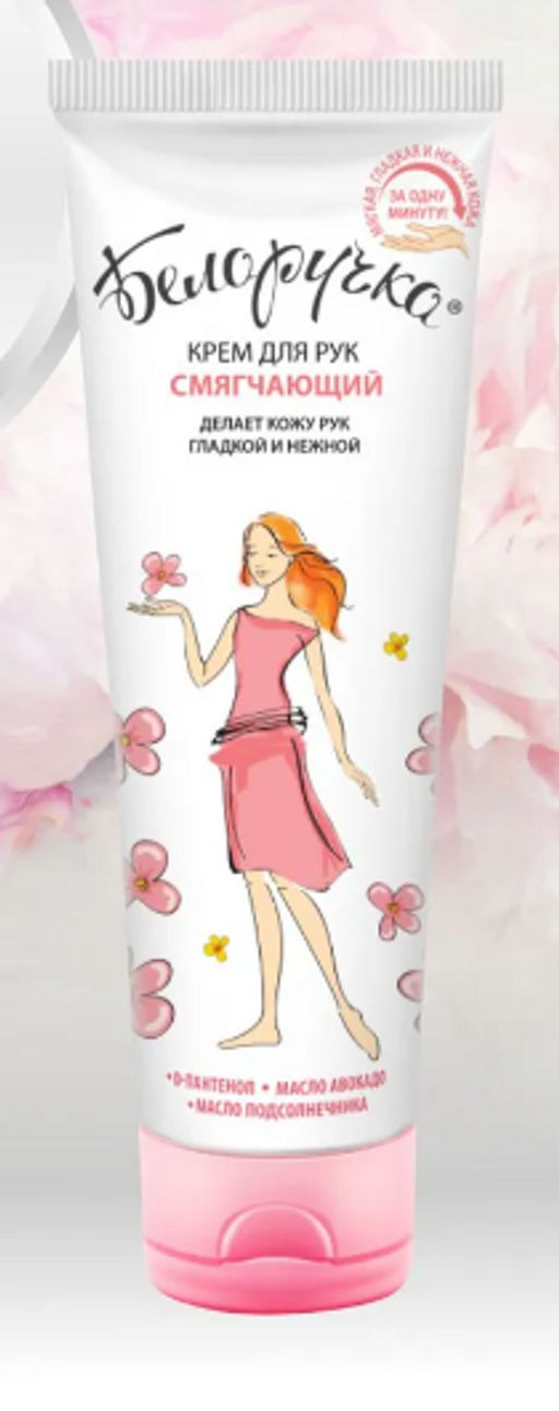 Белоручка Крем для рук Смягчающий 75 мл. Стоит лишь помыть руки мылом или на минуту снять перчатки на улице, как кожа сразу становится сухой, шелушится и появляются трещинки? Крем Белоручка "Смягчающий" с активным комплексом из натуральных масел и D-пантенола способствует восстановлению гидролипидного баланса кожи, усиливает её защитные функции, обеспечивает комфортное состояние кожи рук. D-Пантенол увлажняет, способствует сохранению гладкости и эластичности кожи. Масло Авокадо обладает питательной ценностью и увлажняет кожу. Масло Подсолнечника участвует в формировании защитного барьера. Express уход - быстрое впитывание, нежная и красивая кожа за несколько минут.