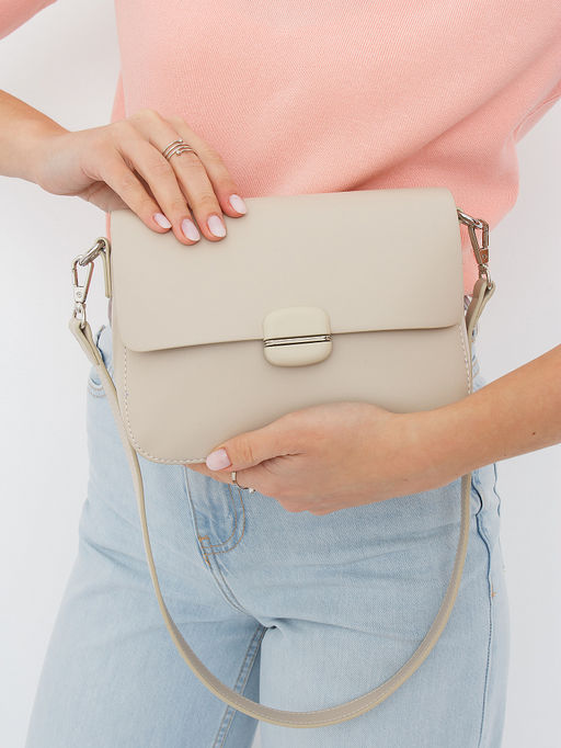 Сумка кросс-боди, выполнена из экокожи. Декорирована застежкой на передней части. Дополнена золотистой фурнитурой. Данная модель закрывается на клапан, носится в руке за ручку или на плече. В комплекте имеется съемный плечевой ремень и удлиненная ручка. Каркас полужесткий.