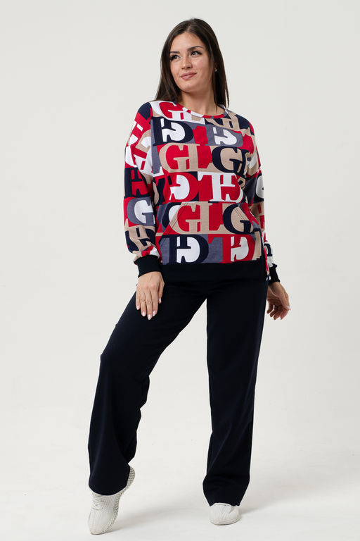 Костюм женский с брюками. На толстовке карман-кенгуру, боковой шов плавно переходит на перед, внизу которого небольшие разрезы, по переду внизу пояс. Горловина овальной формы, обработана небольшой бейкой. Брюки трубы с удобной посадкой, в боковых швах внутренние карманы. Костюм отлично подходит как для дома, так и для носки под верхнюю одежду.