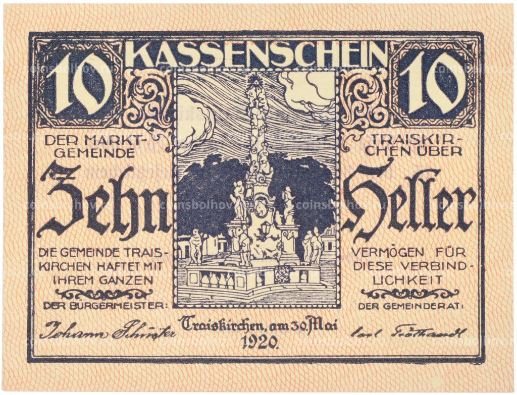 Банкнота 10 геллеров 1920 года Австрия город Трайскирхен (Нотгельд)
