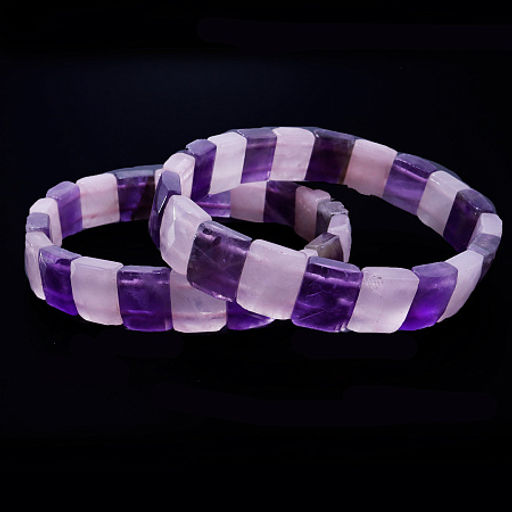 Браслет из розового кварца и аметиста с огранкой, широкий, безразмерный, на резинке. Браслет из натурального аметиста пользуется особой популярностью. Его носят не только как изысканное украшение, подчеркивающее красоту руки, но и как талисман, ведь считается, что эти камни наделены сильнейшими магическими свойствами.