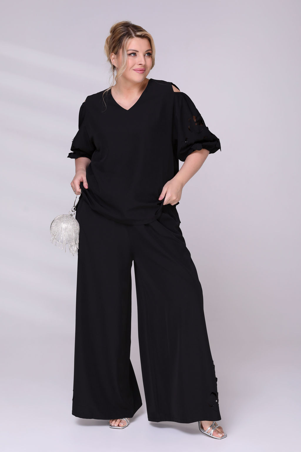 Костюм брючный с вырезом на плечах и выбитыми рисунками в цветок черный