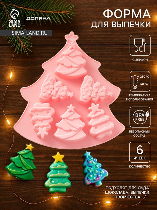 • Форма для выпечки новогодняя Доляна «Ёлочки», силикон, 22×20.6×2.5 см, 6 ячеек, розовая