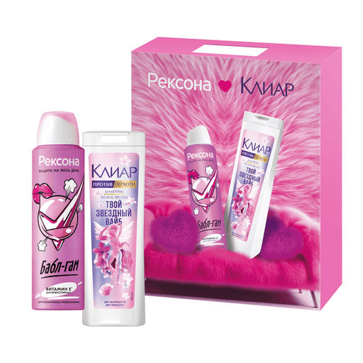 Рексона + Клиар Подарочный набор уходовой косметики для женщин это отличный выбор для презента на любой праздник и просто так. В комплект входят два эффективных продукта: шампунь для жирных волос от перхоти и дезодорант-антиперспирант женский спрей. Шампунь против перхоти женский Floral Splash дает пышную пену и эффективно очищает волосы и кожу головы, не пересушивая их. В состав продукта входит пироктон оламин, который оказывает антибактериальный эффект и обеспечивает до 100% защиты от перхоти. Шампунь для подростков-девочек обогащен экстрактом розы, который, в сочетании с другими активными компонентами, преображает локоны, делая их более гладкими и красивыми. Очищающий шампунь для волос Клиар Floral Splash это оптимальное решение для жирных у корней локонов и кожи, склонной к образованию перхоти. Шампунь от жирных волос у корней вернет локонам свежий и ухоженный вид, чтобы вы наслаждались своей прической и чувствовали себя уверенно! Дезик женский спрей Рексона Бабл-гам обеспечивает надежную защиту от запаха и пота на 48 часов*. Аэрозольный женский дезодорант содержит витамин E**, оказывает увлажняющий эффект на кожу подмышек. Дезодорант-аэрозоль имеет приятный запах бабл-гам, созданный для тех, кто играет по своим правилам. Средство не оставляет следов на одежде, способствует восстановлению кожи подмышек. Рексона дезодорант идеально подойдет как для женщин, так и для девочек-подростков с 14 лет. Антиперспирант от запаха пота подмышек не содержит этиловый спирт, не имеет в составе парабенов и красителей. Дезодорант-спрей женский дерматологически протестирован и подходит для ежедневного применения. Подарочный набор для девушки Рексона + Клиар можно купить своей дочери, племяннице, сестре. Стильный бьюти бокс никого не оставит равнодушной. Удаляет видимую перхоть при регулярном использовании.