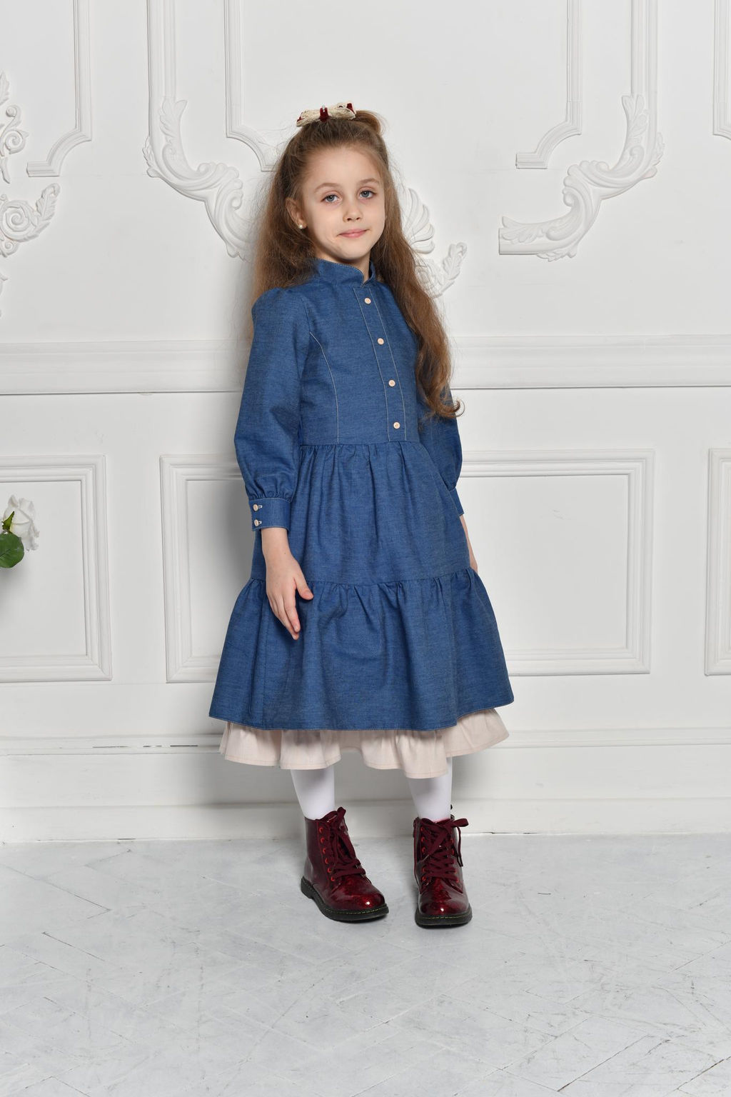 Платье для девочки, предназначено для повседневной носки , а также подойдет для торжественных случаев в любое время. Платье выполнено из джинсовой ткани. Элегантный фасон,рукав длинный,Выполнено на молнии. Сзади по талии регулируется втачным по бокам поясом.