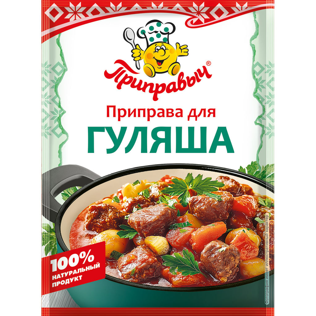 Приправа для гуляша является специальной смесью пряностей, сушёных овощей, подчеркивающих и дополняющих вкус Вашего блюда! Состав: перец черный молотый, перец красный молотый, перец душистый молотый, паприка, кориандр молотый, семя горчицы, хмели-сунели, морковь, томаты, майоран, тмин, лук, чеснок, чабер, соль.
