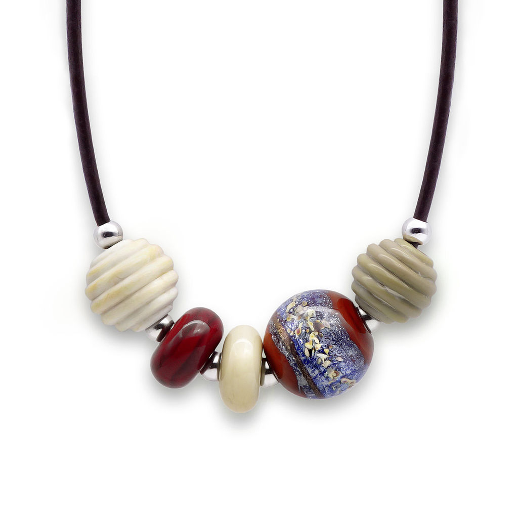 Колье изготовлено из натуральной кожи, муранского стекла и гипоаллергенной ювелирной стали, что очень важно для людей с чувствительной кожей. Металл не темнеет и не подвергается воздействиям окружающей среды, надолго обеспечивая красивый внешний вид изделия. Длина колье - 46 см + 5 см. удлиняющая цепочка. Диаметр стеклянных бусин - 1,5, 1,8 и 2,2 см. Рондели 0,9х1,6 и 1х1,8 см. Вес - 41 гр.­