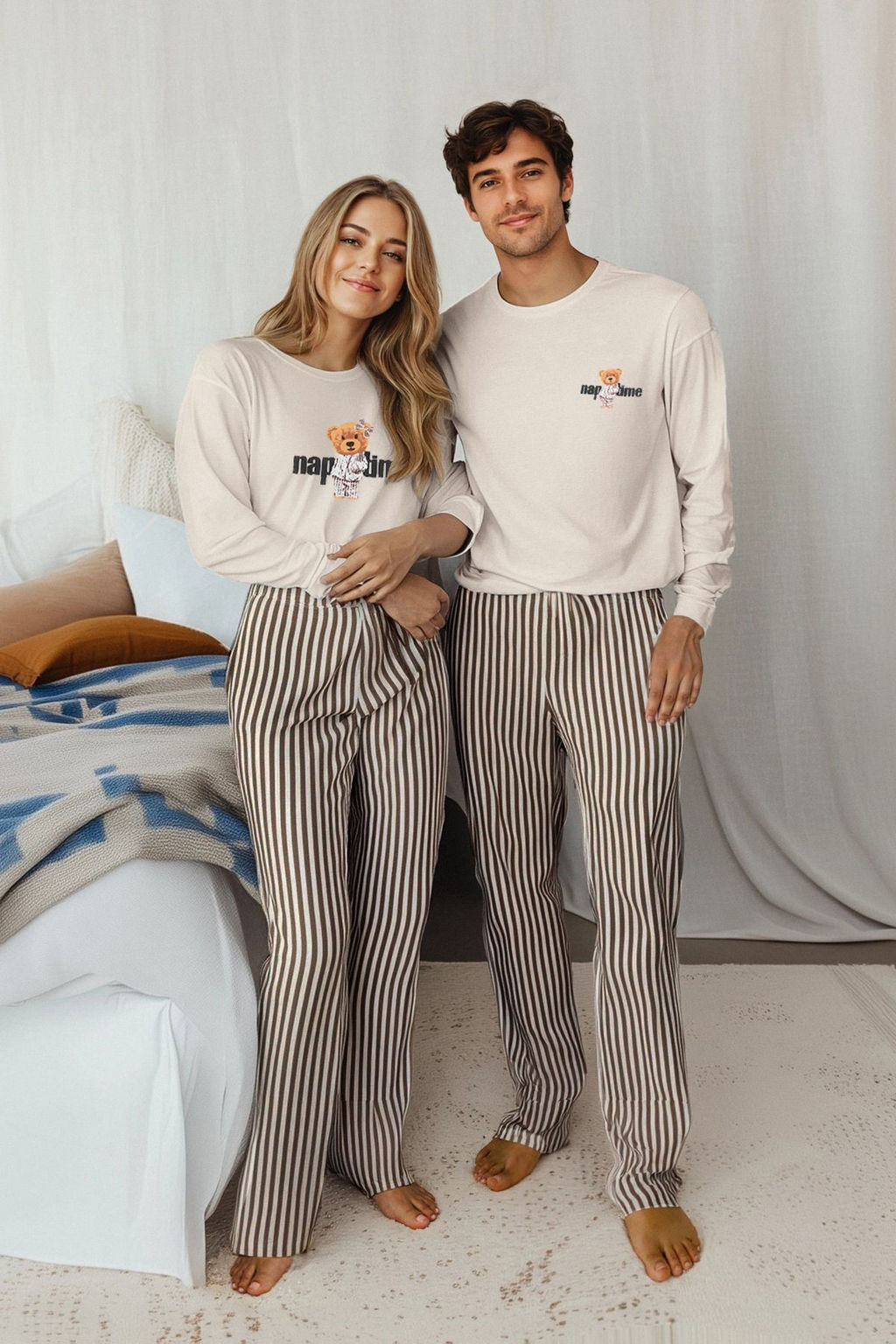 • Bej - Kahve Regular Fit Cizgili Couple/Cift Orme Erkek Pijama Tak?m? TMNAW25PT00049