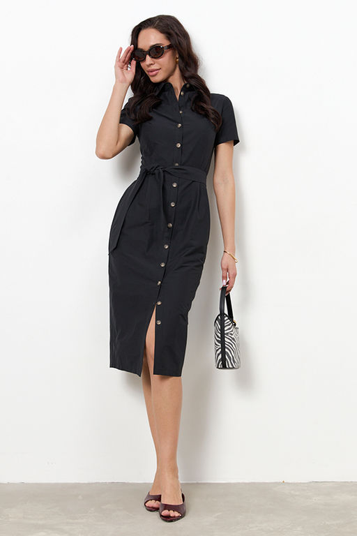 Платье приталенного силуэта из хлопковой плательной ткани. Изделие отрезное по линии талии с защипами. В боковых швах карманы. Втачной короткий рукав. Притачная планка с застёжкой на пуговицы. Вырез горловины обработан отложным воротником на стойке. В комплекте пояс из основной ткани.