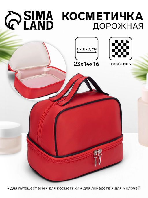 Косметичка-сундучок на молнии, с двумя отделами, с ручками, однотонная, красная