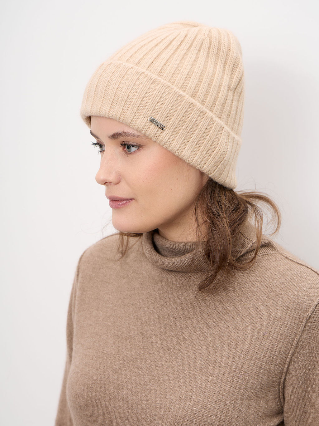 Лаконичная женская шапка из натурального кашемира идеальный выбор для холодного сезона. Модель выполнена в универсальном бежевом оттенке, который легко сочетается с базовым и классическим гардеробом. Мягкая фактура и аккуратная форма обеспечивают комфортную посадку и элегантный внешний вид.