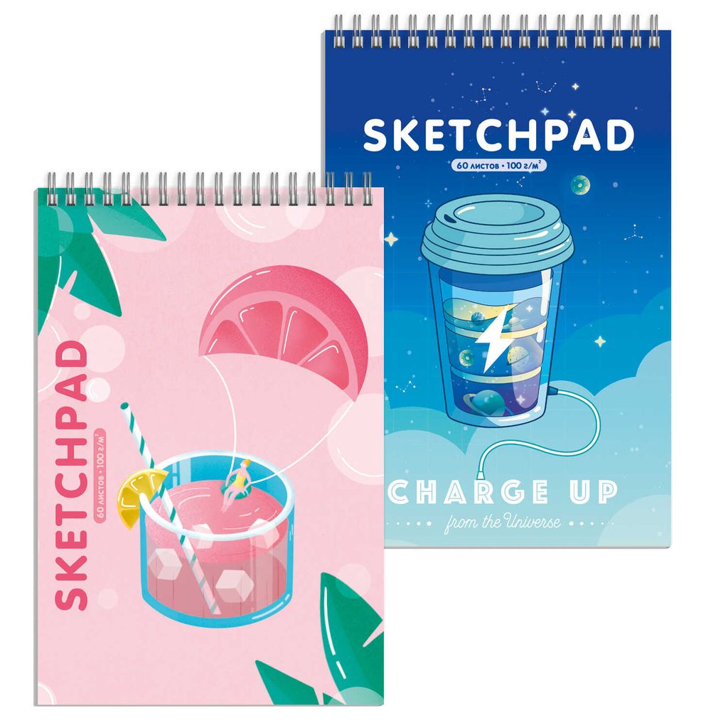 Скетчпад А5 148х210 мм, 60 л, блок - белый офсет 100 г/м2, арт. 59348 БОДРЯЩИЕ КОКТЕЙЛИ /обложка полноцветная печать, твёрдый переплёт на гребне, матовая ламинация,