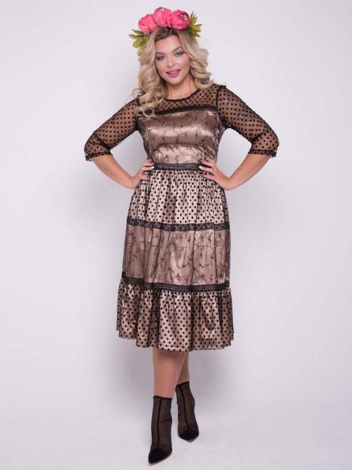 Платье прилегающего силуэта из  сетки с принтом горох и цветы на подкладе.