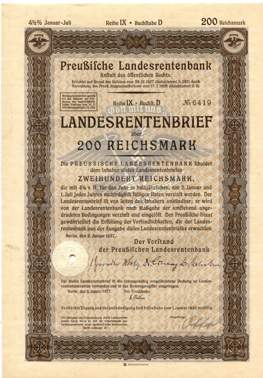 • Облигация 4,5% 200 рейхсмарок 1937 года Германия