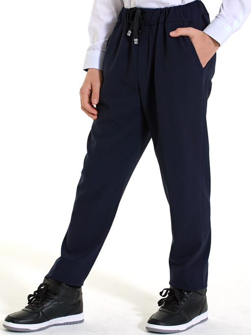 Брюки-джоггеры для мальчика из костюмной ткани с начесом, прямые, с наклонными боковыми карманами, на подкладке. На правой задней половинке карман в листочку. В поясе эластичная резиновая тесьма и шнур для регулирования объема по талии. Состав:32% вискоза, 63% полиэстер, 5% лайкра