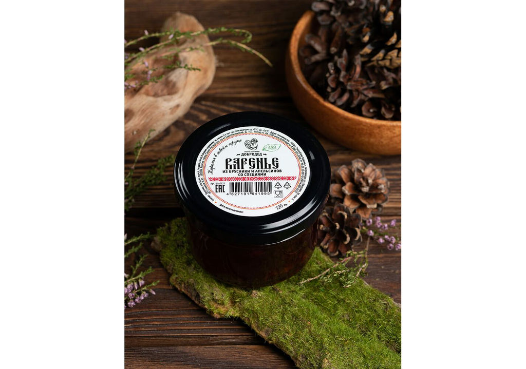 Состав: брусника, апельсин, вода, сахар, загуститель- Е1442; регуляторы кислотности- лимонная кислота, цитрат натрия; консерванты; сорбат калия, бензоат натрия; корица, гвоздика. Производится на предприятии, где используются мёд, орехи.