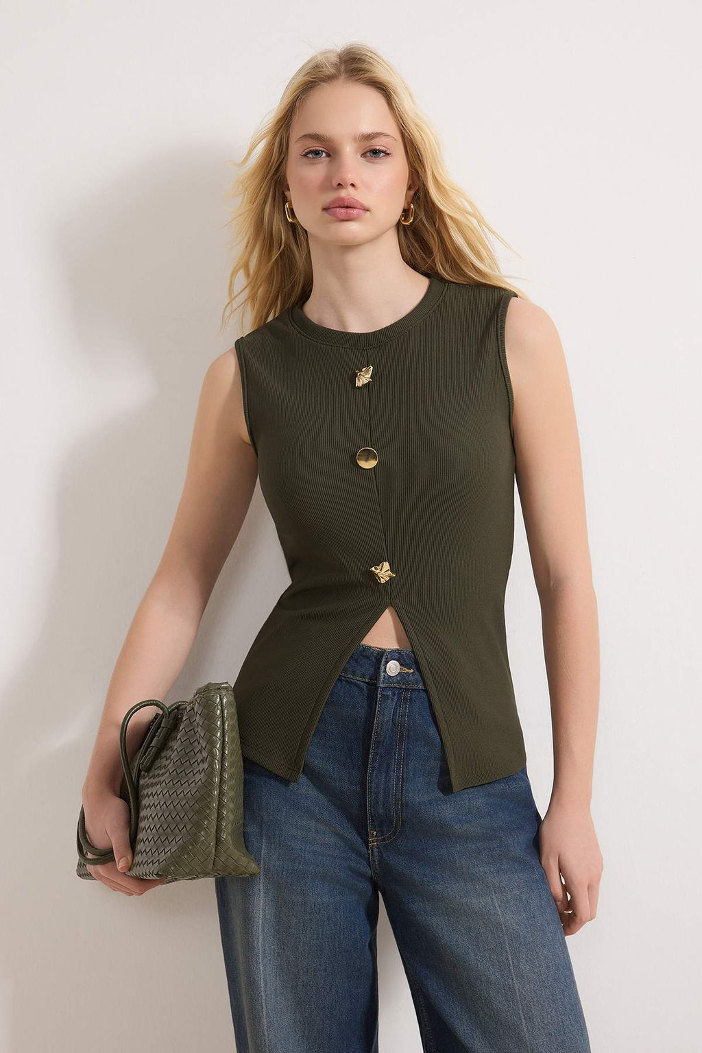 • Haki Aksesuar Dugmeli Bisiklet Yaka Regular Boy Yelek Orme Bluz TWOSS25BZ00558