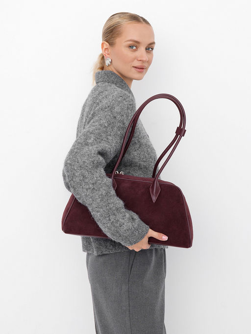 Актуальная базовая модель, выполнена из замши.  Дополнена золотистой фурнитурой. Данная модель закрывается на молнию, носится в руке или на плече. Каркас полужесткий.