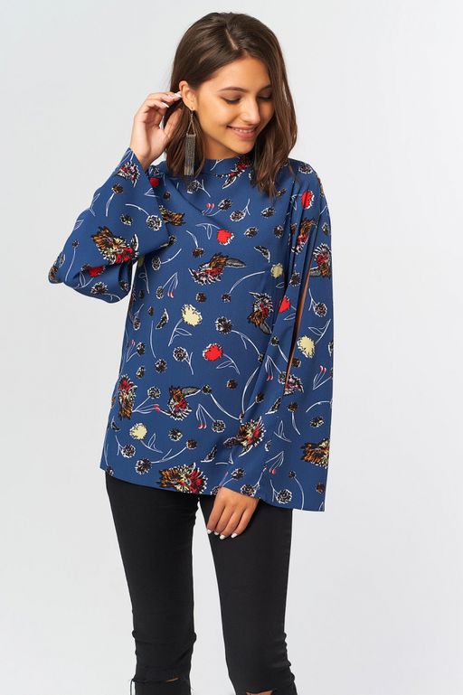 Особенности: Блузка прямого силуэта из блузочной ткани. Детали: расклешеный рукав с щелью по среднему шву, V-образный вырез горловины по спинке, воротник-стойка переходящий в завязки. Без застежки.