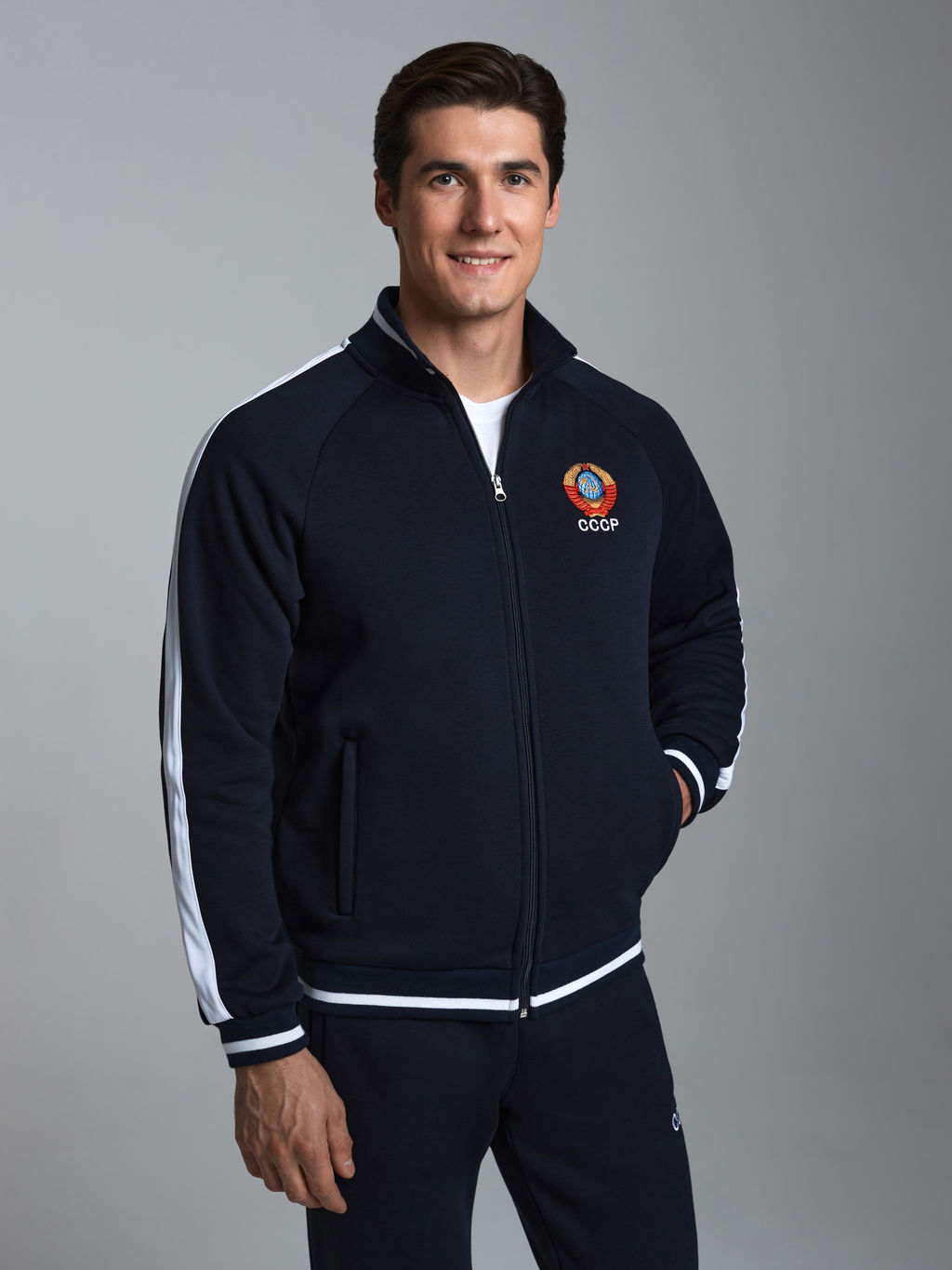 Спортивный костюм из трехниточного трикотажа с начесом по изнанке. Карманы на куртке и брюках прорезные с листочками на молнии. Посадку по фигуре обеспечивает эластичная рибана по воротнику, поясу и манжетам. Брюки прямые. Пояс по линии талии регулируется шнурком. На полочке вышивка "герб СССР", на спинке аппликация "СССР".
