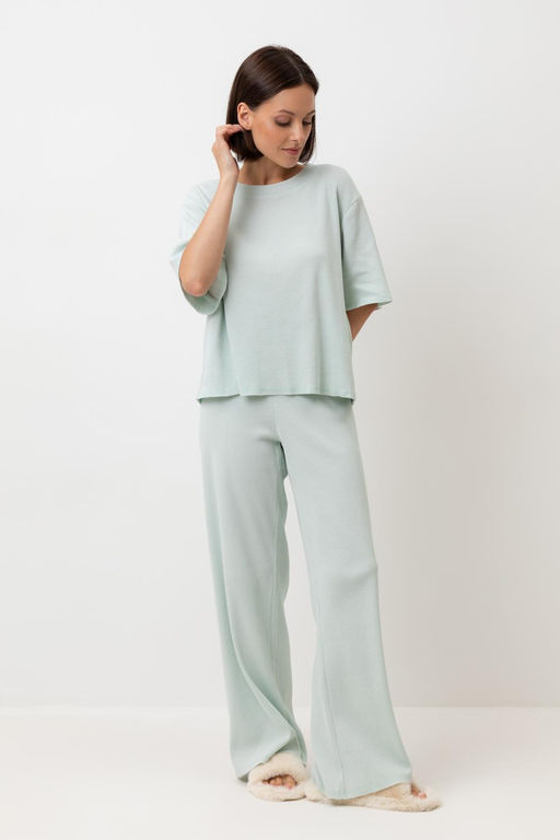 Комплект из объемного трикотажа с добавлением эластичных волокон. Свободный силуэт, мягкий пояс и отсутствие боковых швов на брюках обеспечат комфорт во время сна и отдыха.. Состав: 95% хлопок, 5% спандекс