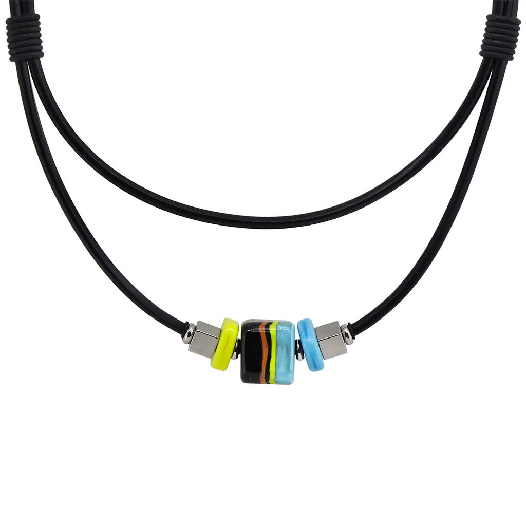 Колье изготовлено из натуральной кожи, муранского стекла и гипоаллергенной ювелирной стали, что очень важно для людей с чувствительной кожей. Металл не темнеет и не подвергается воздействиям окружающей среды, надолго обеспечивая красивый внешний вид изделия. Длина колье - 46 см + 5 см. удлиняющая цепочка. Размер стеклянных бусин - 1,5х1,5 и 0,5*1,2 см. Вес - 31 гр.