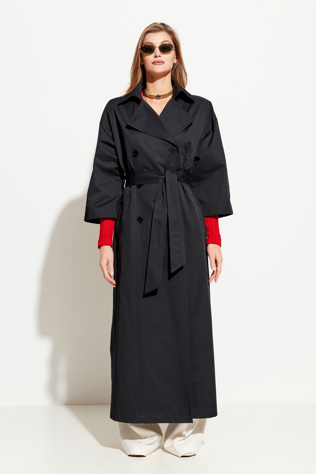 Плащ А-образного силуэта, длиной ниже линии колен. Воротник стояче-отложной. Линия плеч спущена. Рукава укороченные, широкие. По бокам прорезные карманы. Объем изделия регулируется при помощи широкого пояса из аналогичной ткани. Задняя часть плаща декорирована принтом параллельно рельефному шву. Стильная, универсальная модель для создания ежедневных эффектных образов.