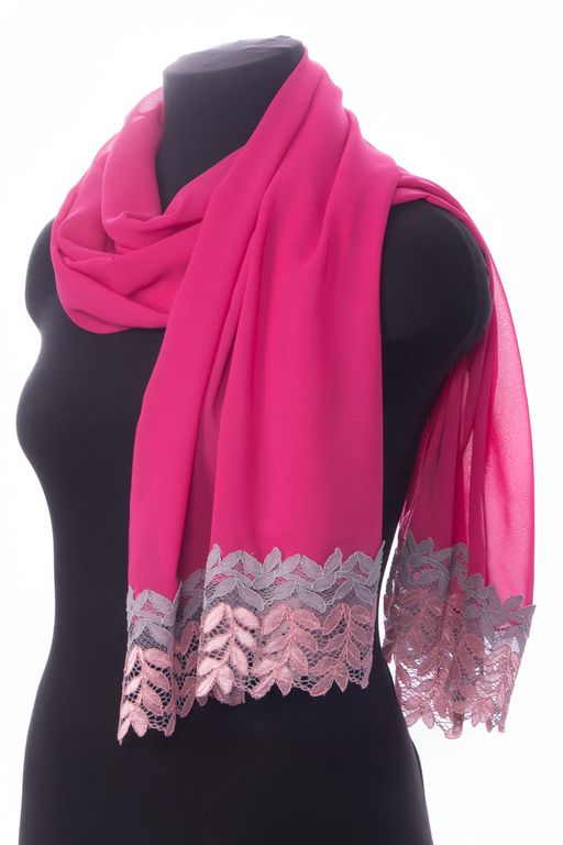 Однотонный шифоновый палантин цвета фуксии декорирован широким дорогим кружевом.