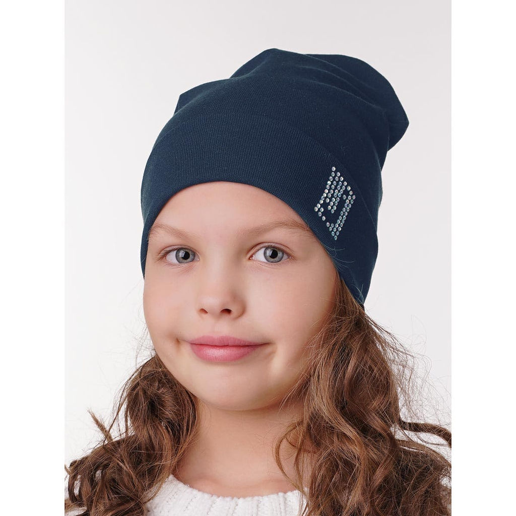 Двойная шапочка, из трикотажного полотна с отворотом. Декорирована фирменным лейблом из страз. Подойдет на температуру от 0 до + 10 градусов.